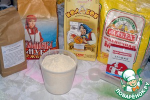 Это, собственно, все продукты которые нам нужны. Муку брала 3-х видов - пшеничную в/с, пшеничную грубого помола и ржаную. На фото забыла добавить масло растительное и сахар.