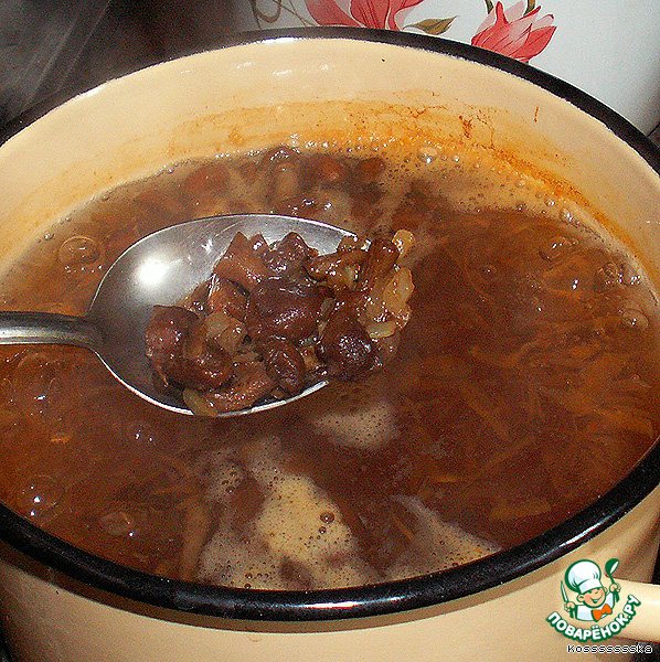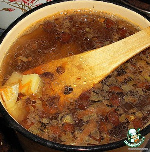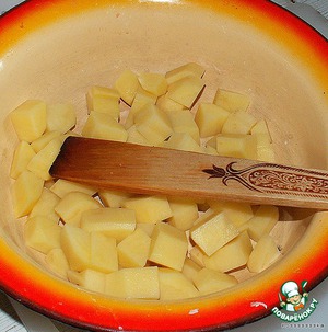 Варим суп до полуготовности половинок картошки, затем кидаем туда зажарку...