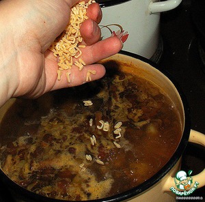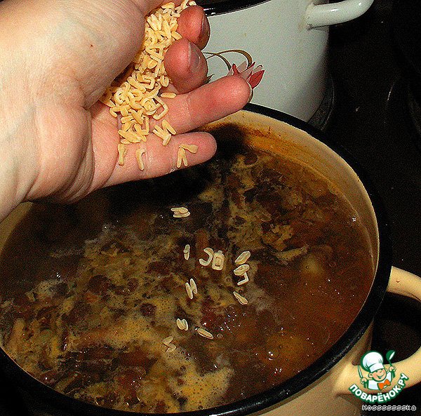 Добавляем к морковке в кастрюле половину грибов из пакетика.