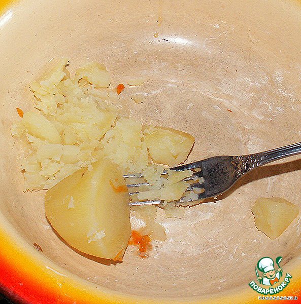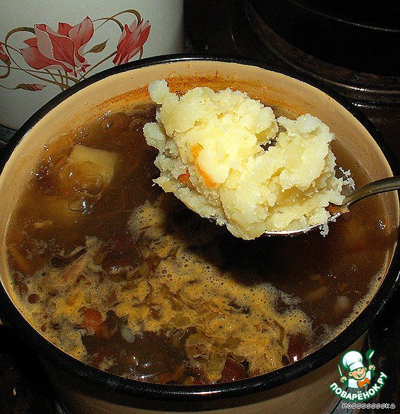 Варим до готовности. За 5 минут до снятия с огня вынимаем половинки картофеля и разминаем вилкой.
