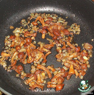 Кидаем к луку оставшиеся грибы, обжариваем. Тягучий сок, который выделяют опята при жарке, хорошо карамелизует лук.