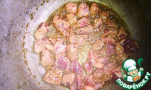 Мясо режем на кусочки 50-60 г и обжариваем в полученном раскалённом жиру.