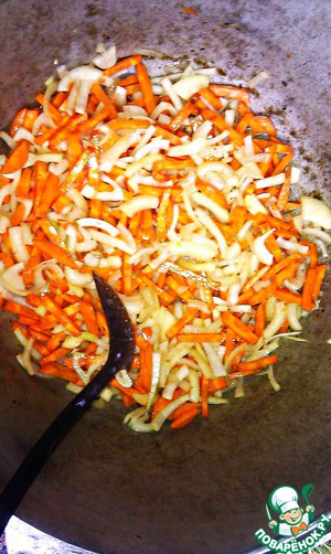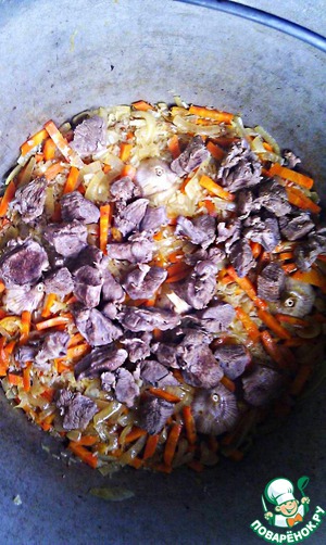 Затем мясо вынимаем и ставим вариться. В жир, смешанный с соком от мяса, засыпаем морковь и лук.
