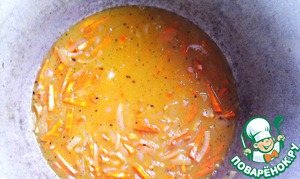 Бульоном заливаем овощи. Туда же высыпаем все специи, перемешиваем и даём протушиться 5-10 мин. -