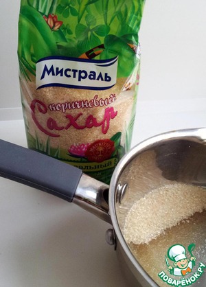 В сотейник насыпать 130 гр коричневого сахара и влить 2 ст. л. воды (только чтобы немного смочила сахар). Поставить сотейник на средний огонь и, помешивая, довести до кипения. После закипания дать карамели покипеть 3-5 мин., не мешая.