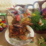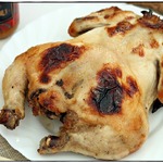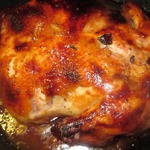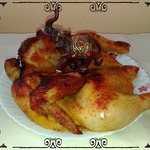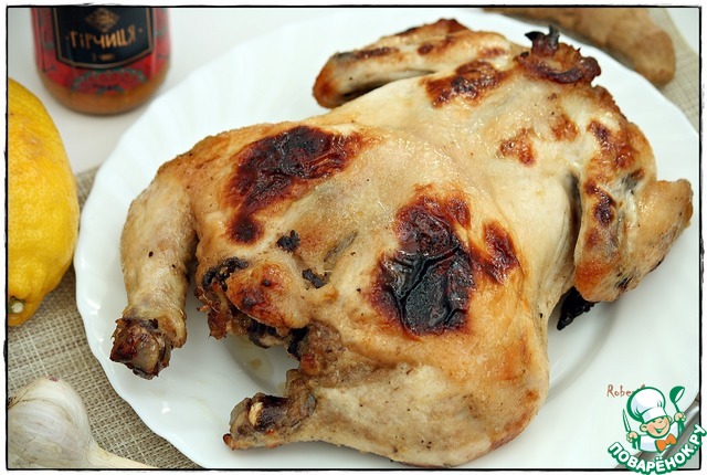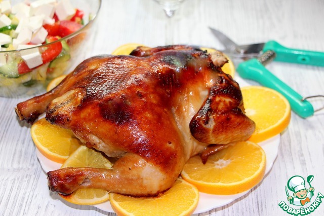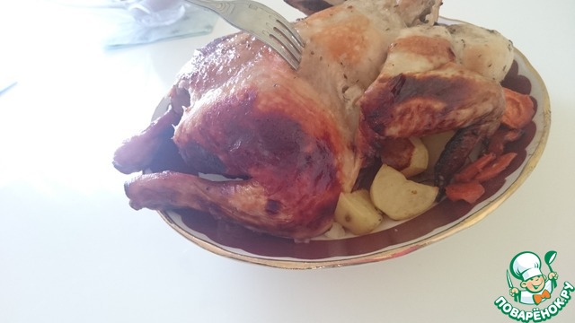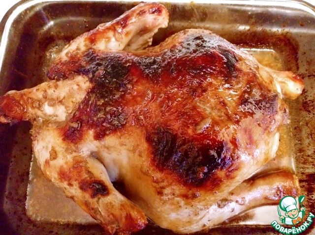 Замаринованная курица отправляется в горячую духовку примерно на 1-1,5 часа, все зависит от веса тушки и особенностей вашей духовки.