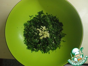 Выкладываем в удобную ёмкость кинзу (у меня она тоже замороженная, так же как и укроп), любая зелень, какую вы любите, выдавливаем чесночок, перчим.