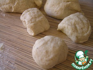 Затем тесто вымесить с добавлением муки (сколько возьмет), чтобы не липло к рукам. Оставить на 30-40 минут отдыхать. Затем разделить на 7-12 частей.