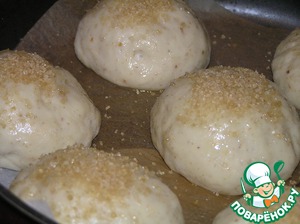 Из каждой части сформировать шарик, уложить в подходящую форму, застеленную бумагой для выпечки. Каждый шарик сверху смазать маслом, посыпать коричневым сахаром. Накрыть и оставить в теплом месте на 30-40 минут.