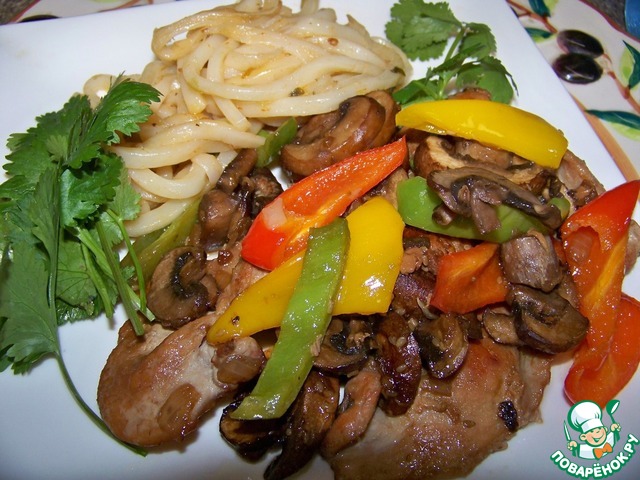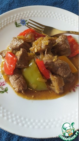 Получается очень вкусное мяско с овощами и грибами в великолепном соусе. Соевый соус придает блюду "китайскую" нотку. Красивое и простое блюдо, которым не стыдно угостить гостей.