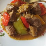 Добавляем наше мясо, перемешиваем и оставляем тушиться под закрытой крышкой. Обычно сока, которое содержится в мясе, хватает для того, чтобы мясо протушилось. Если жидкость выпарилась, но мясо не готово, добавьте немного воды.