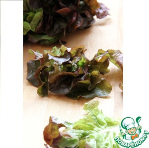Остальной процесс идет гораздо быстрее. Зеленый салат (я брала салат «Дубовые листья», но можно взять любой салат, кроме руколлы) вымыть, высушить и нарезать на достаточно крупные куски.