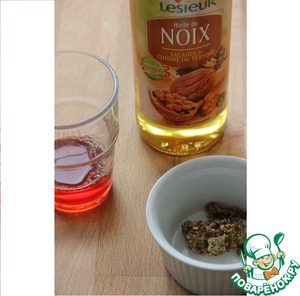 Приготовить соус: смешать 3ст. ложки орехового масла (можно заменить растительным), 1ст. ложку малинового уксуса (можно заменить бальзамиком) и 1ч. л. дижонской горчицы.