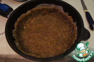 Массу плотно утрамбовать на дно формы, не забыв оформить бортики, закрыть пищевой пленкой и поставить в морозилку.