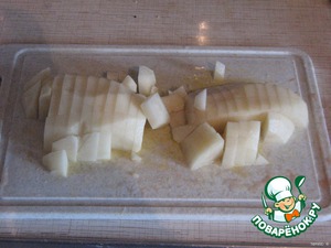 Берем половинку помидора, очищаем от кожицы. Нарезаем кубиками, добавляем к морковке.