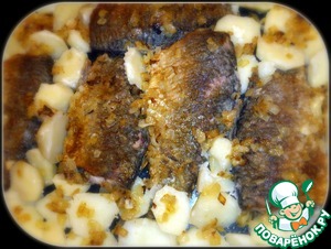 Залейте рыбу сметанным соусом, посыпьте сухарями.