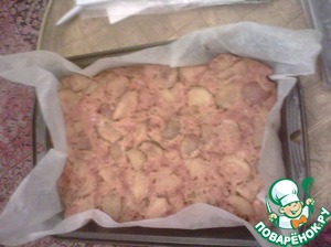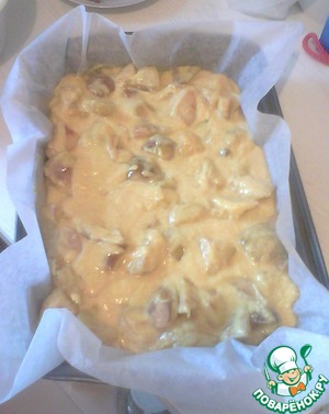 Груши вместе во всем соком, который они пустили, до последней капли, перемешиваем с тестом и выкладываем в форму, выстланную бумагой для выпечки.