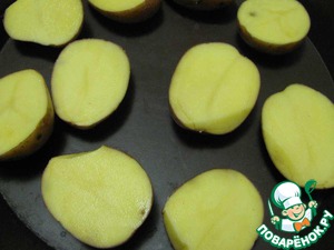 1. Картофель вымыть тщательно и разрезать вдоль пополам.