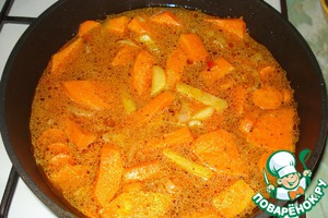 • Далее заливаем овощи куриным или овощным бульоном. Добавляем любимые специи, солим, закрываем крышкой и оставляем тушиться на маленьком огне 30-40мин.