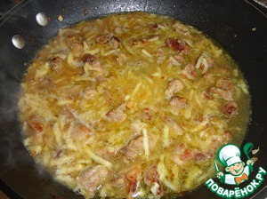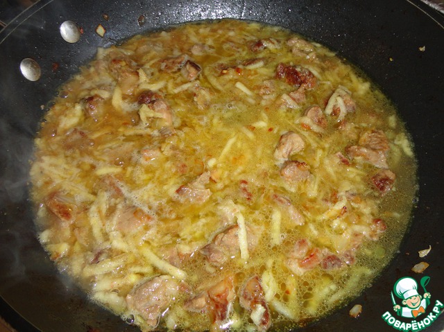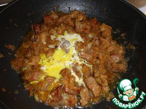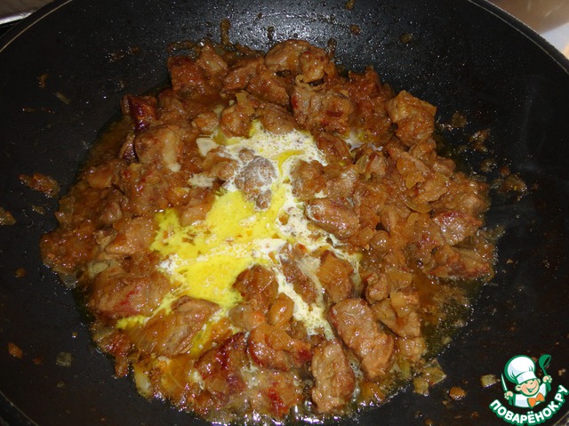 Сразу после этого добавляем вино и воду. Оставляем мясо тушиться до тех пор, пока соус не станет более густым.