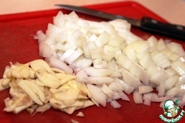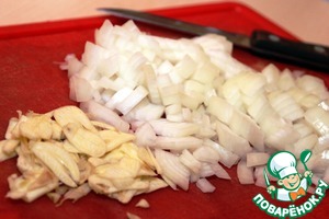 Добавить лук и чеснок. Жарить до прозрачности лука. -