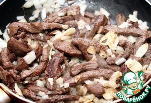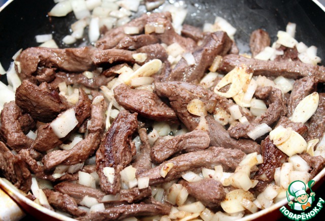 Мясо обжарить в сковороде с добавлением растительного масла минут 15.