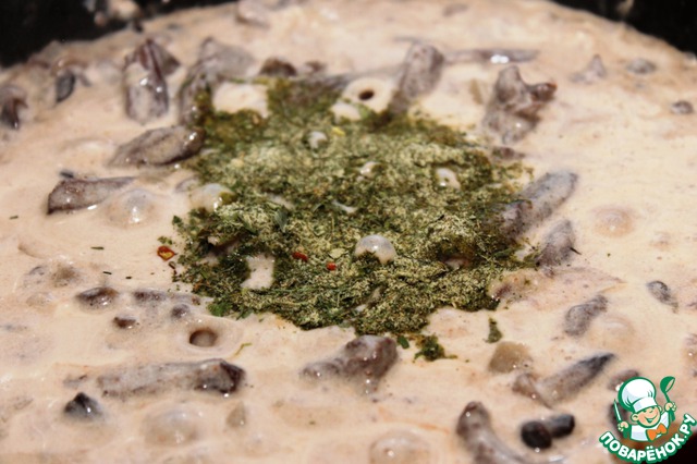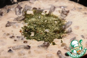 Сметану смешать с паприкой, солью и мускатным орехом. Влить к мясу. Посыпать сухими травами.