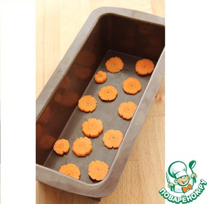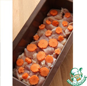 Затем выложить слой маринованного мяса. Затем снова слой моркови и снова мясо.
