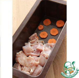 Итак, начнем. Мясо нарезать на небольшие кусочки. Смешать. Я готовила с куриной грудкой и спинкой кролика, но скажу сразу, что получается сочнее с куриными и кроличьими ножками.