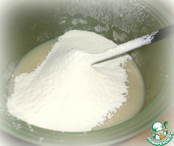 Затем, постепенно добавляя просеянную муку (250г), перемешиваем.