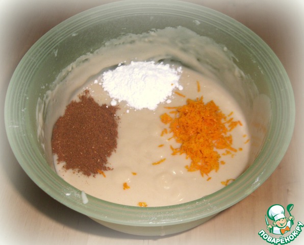После отдыха включаем духовку на 165 градусов, добавляем в тесто специи, щепотку соли, разрыхлитель (11г), тертую цедру апельсина (2 ч. л.). Хорошо перемешиваем.