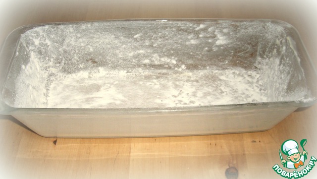 Форму для кекса хорошо смазываем сливочным маслом и присыпаем мукой. Внимание - наш кекс практически не содержит жиров, поэтому не жалейте масла, чтобы он не приставал к форме и не пригорал.
