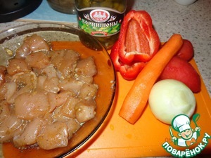 Курицу режем не очень мелкими кусочками, солим, перчим, добавляем немного соевого соуса. Выдавить 2-3 зубчика чеснока и оставляем мариноваться.