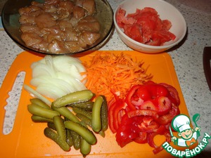 Лук нарезаем полукольцами, морковь - на крупн. теркe, перец - крупными полукольцами, мелкие корнишончики - вдоль пополам. Помидоры у меня из заморозки, поэтому ошпарила кипятком, сняла кожу и нарезала, как могла. -