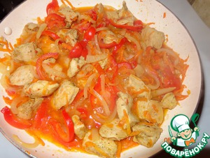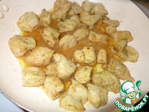 Разогреваем на сковороде растительное масло, отправляем нашу курочку обжариваться. Поскольку у меня грудка, а она обычно суховата, я накрыла крышкой, чтобы курочка потушилась и была мягкой.