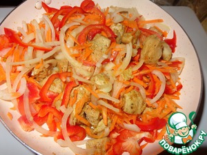Минут через 10-15, когда сок от курицы с соевым соусом выкипели, добавляем лук, морковь и болгарский перец. Хорошо перемешиваем и оставляем тушиться до мягкости овощей. Я накрываю крышкой, чтобы было сочнее и быстрее. Задача - не зажарить, а потушить.