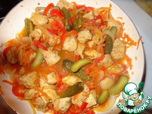 Немного даем покипеть и добавляем корнишоны, перемешиваем и тушим минут 10.