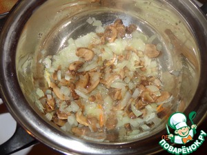 Я решила, что это блюдо очень хорошо будет сочетаться с рисом. Обжарила в кастрюле с толстым дном мелко нашинкованный лучок, добавила грибы, обжарила еще минут 5. -