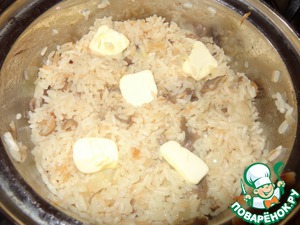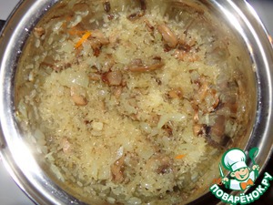 Засыпаем сухой пропаренный рис и обжариваем вместе луком и грибами в масле до золотистости.