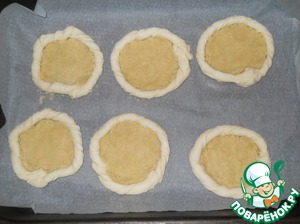 Ставим в духовку на 5-7 мин. Когда тесто немного подпечется, выкладываем в центр колец на крошку ванильный крем и смазываем тесто белком. Ставим в духовку до золотистого цвета теста.