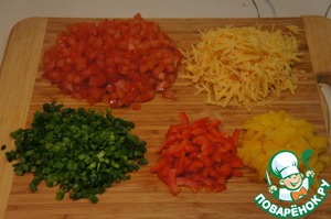 Помидоры и перец нарезать маленькими кубиками, лук измельчить, сыр натереть. Все ингредиенты смешать в миске.