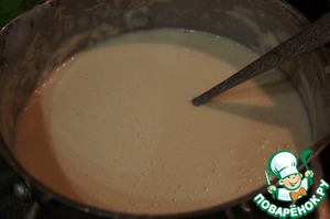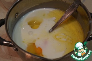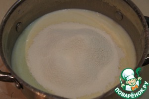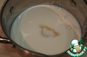 Кефир вылить в кастрюлю, всыпать сахар, соль и соду, перемешать.
