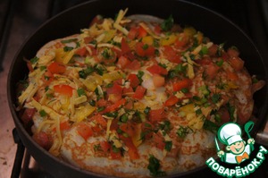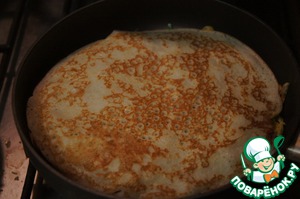 Горячие блины складывать в форму или глубокую сковороду и пересыпать начинкой.