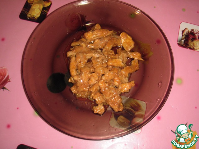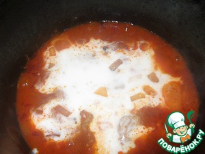 Соус добавляем к мясу. Перемешиваем. Закрываем крышкой и тушим 20 минут (на медленном огне).