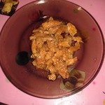Я немного пережарила мясо (засиделась в Поваренке ))). Лук режем кубиками и добавляем к мясу. Перемешиваем. Приправляем (солим, перчим) и обжариваем 2 минуты.
