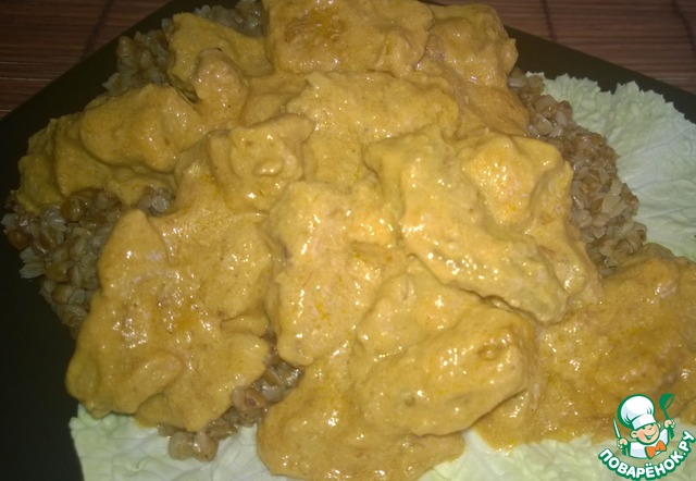 Пока мясо тушится, займёмся соусом. Крахмал разводим с 3 ст. л. холодной воды. Ставим кастрюльку на небольшой огонь, добавляем сливки, помешиваем. Как только масса нагреется, добавляем сметану. Прогреваем при постоянном помешивании 2 минуты.