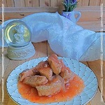 Добавляем к мясу томатный соус, в идеале соус «Сацебели», я брала простой томатный соус для шашлыка. Если соус слишком густой, то его надо немного разбавить с водой до состояния жидкой сметаны. Перемешиваем. Тушим на медленном огне.