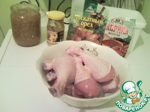 Приступаем к маринованию. Все просто: соль-горчица - чеснок-мед-паприка-м ускатный орех-лимонный сок. Всеми этими ингредиентами натираем окорочка/голени.. Я сделала так: сложила в довольно вместительную ёмкость курицу, натерла (без фанатизма) солью, добавила горчицу (на ваше усмотрение и все последующие ингредиенты тоже), перемешала, затем "чудо -смесь" - перемешала и мускат+паприка - перемешала. Все, оставляем мясо мариноваться, у меня процесс длился 1,5часа. В это время можно сделать соус и /или гарнир...
