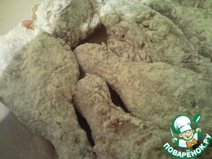 Хорошо разогреваем сковороду и масло, обваливаем в муке промаринованные ножки и обжариваем со всех сторон до полной готовности, примерно по 10 минут с каждой стороны. Корочка должна быть румяной (не горелой, я зазевалась и.. бочок подгорел ), ориентируйтесь по готовности мяса.
