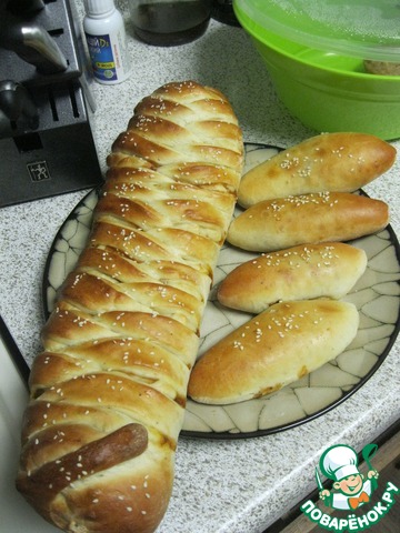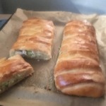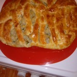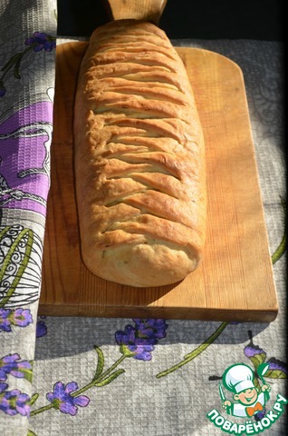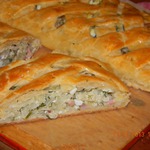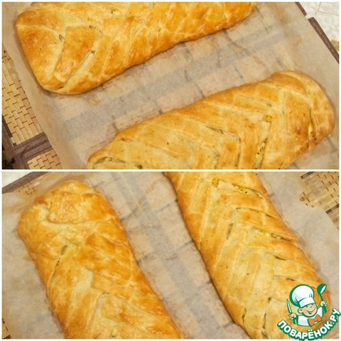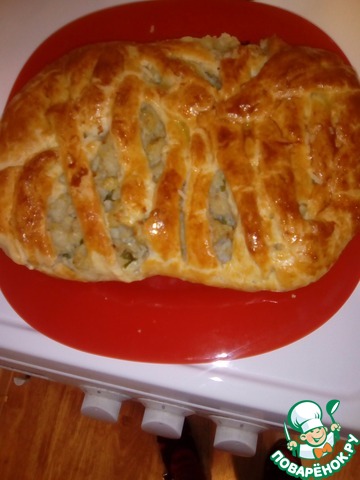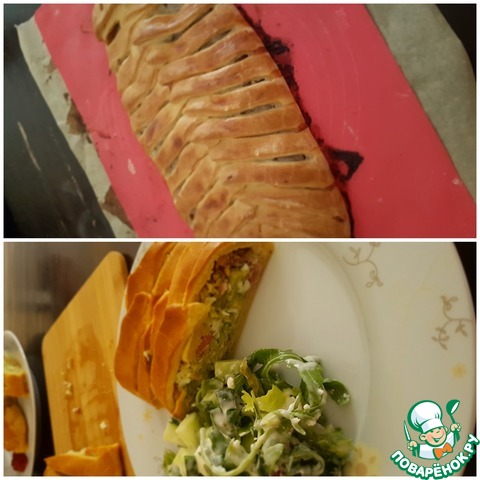 В центре валиком выложить начинку, отступив по 1,5-2 см от торцевых концов. Затем оставшиеся длинные края нарезать на полоски немного под углом. Один торец завернуть на начинку и затем укладывать на начинку поочередно, по одной полоске с каждой стороны, как будто плетете косичку. Последние две полоски оставить. Смазать желтком, взбитым с 1 ч. л. воды торец и эти 2 полоски. Завернуть торец на начинку, затем завернуть последние две полоски, а затем края от торца подвернуть под пирог.